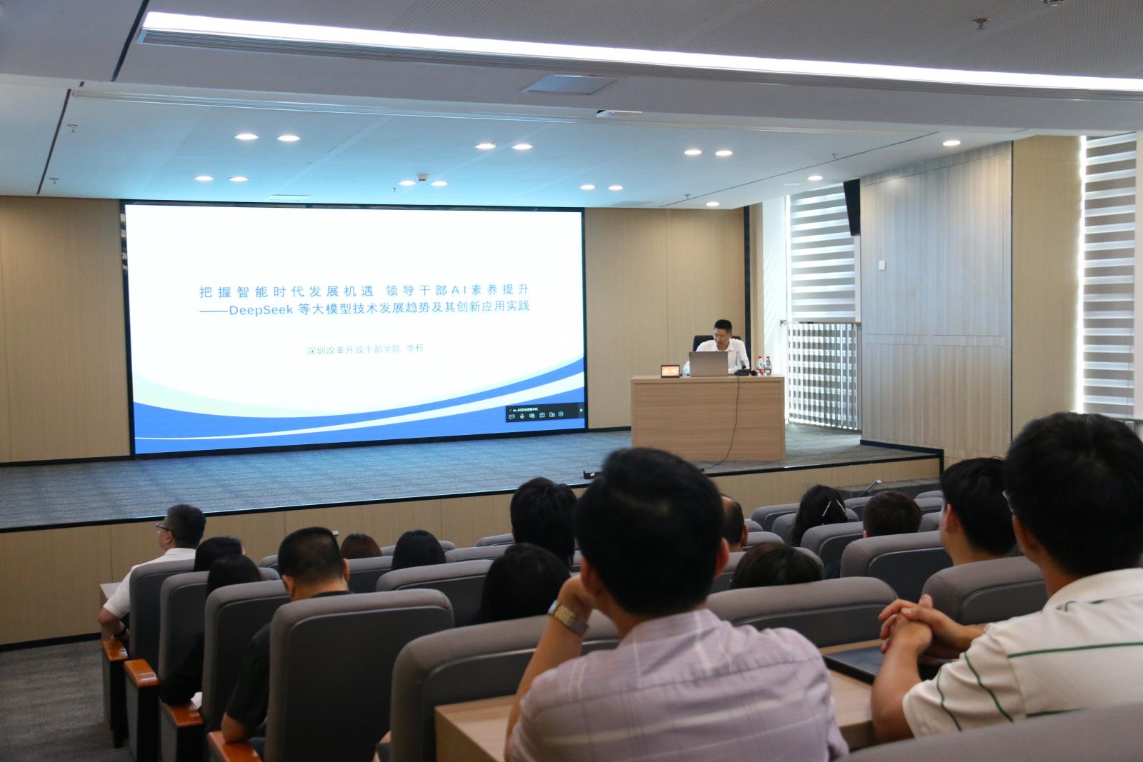 4月29日下午,人工智能专题系列培训在能碳云谷六楼报告厅开班并开展第一期教学培训。此次培训特邀深圳改革开放干部学院信息化负责人、深圳市数字经济产业促进会国际人工智能专委会专家委员、深圳市高校教育信息化学会理事李程同志,围绕“人工智能概述,深圳市人工智能发展现状”作专题辅导。集团本部各部门负责人、业务骨干,辖属企业领导班子成员、各部门负责人与职工代表等百余人参加培训。
