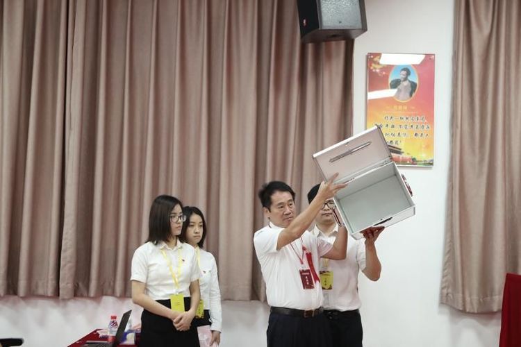 四、总监票人韩垂学同志打开并检查票箱。