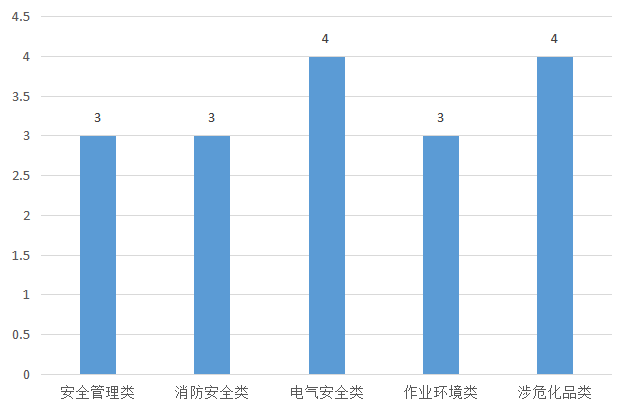 11月23日,投资管理公司吕总、中科安全公司安全专家等一行人前往优耐电子有限公司和君新工业园进行消防安全大排查专项行动,共发现隐患17项(处),其中:安全管理类3项 消防安全类3项 电气安全类4项,作业环境类3项,涉危化品4类.(详情见表1.1、图1.1)。
