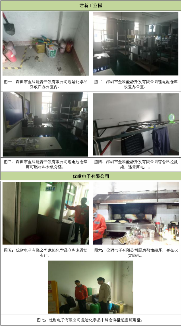 1.君新工业园深圳市金科能源开发有限公司危险化学品存放在办公室内,锂电池仓库设置办公室,锂电池仓库用可燃材料木板分隔,宿舍私拉乱接,违章用电。